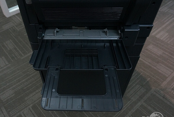 除了標配一個250頁的進紙盒之外,在機身的側(cè)面,上文提到了許多機關(guān),其中一個便可以打開多功能手送托盤,柯尼卡美能達306的多功能手送托盤支持紙張最大的容量為100張,支持的紙張尺寸為A3到A5。