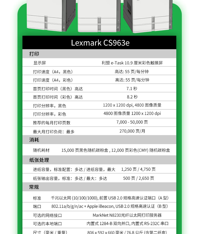 • 利盟(Lexmark)CS963e彩色激光復印機價格圖片參數 55頁/分鐘 文檔裝訂打印之選